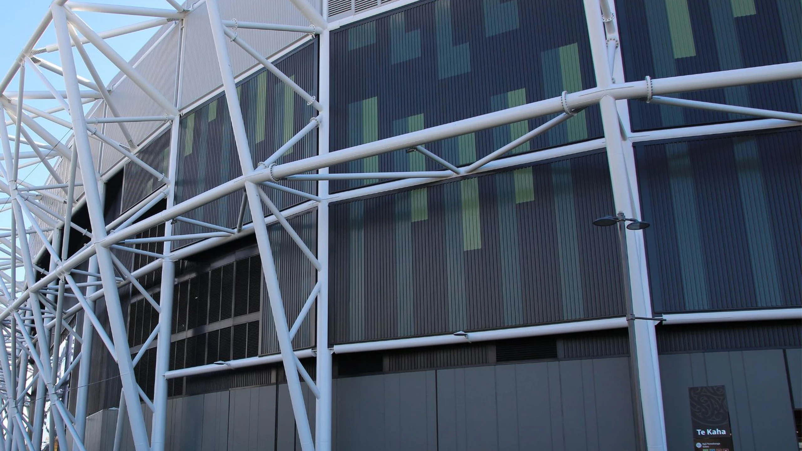 To whakamanuhiri (host, welcome) our guests we acknowledge the environment that surrounds us. This artwork reflects the environment directly behind each side of the facade as you circle the facility.