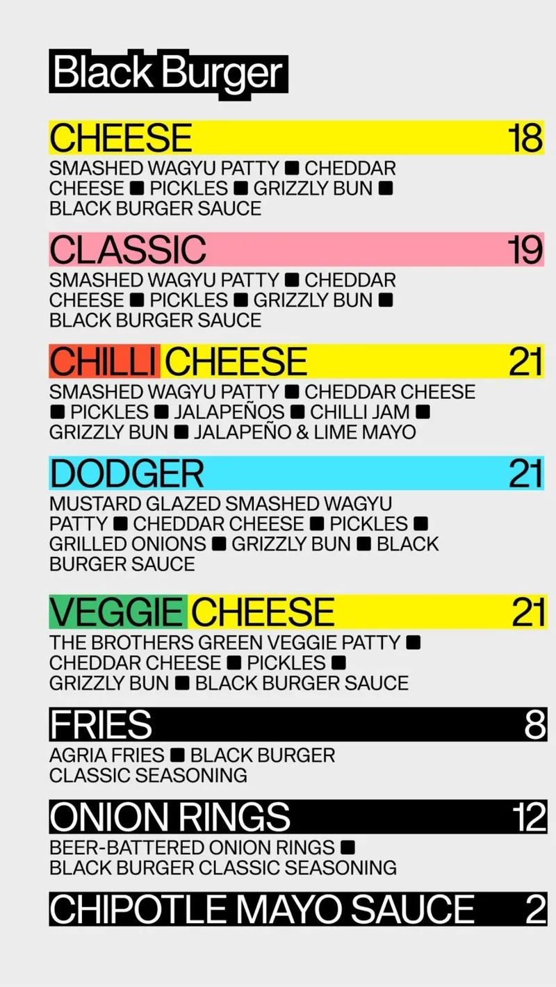 Black Burger's menu includes Cheese, Chilli Cheese, Dodger, Veggie Cheese, Classic, Fries and Onion Rings.