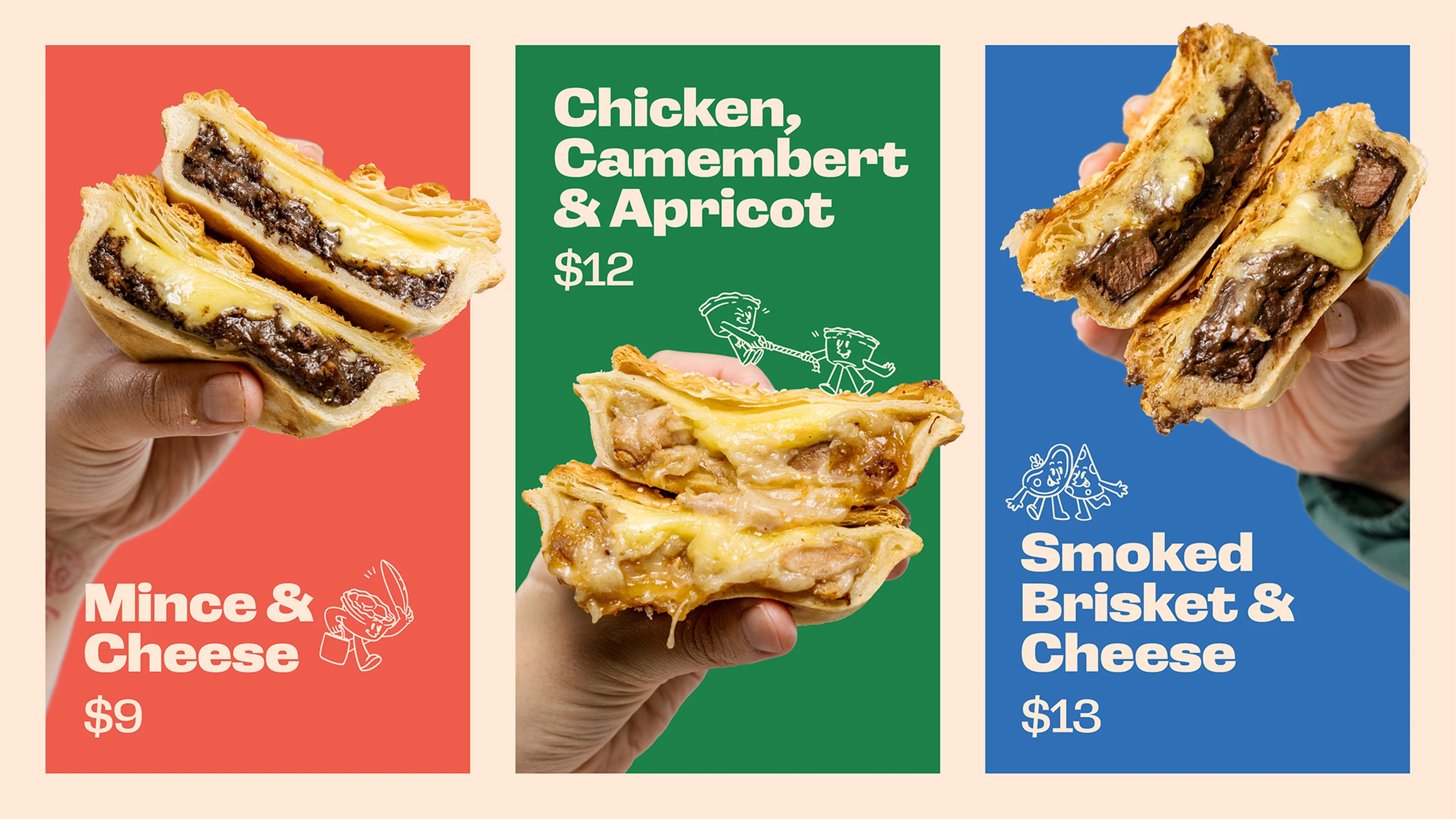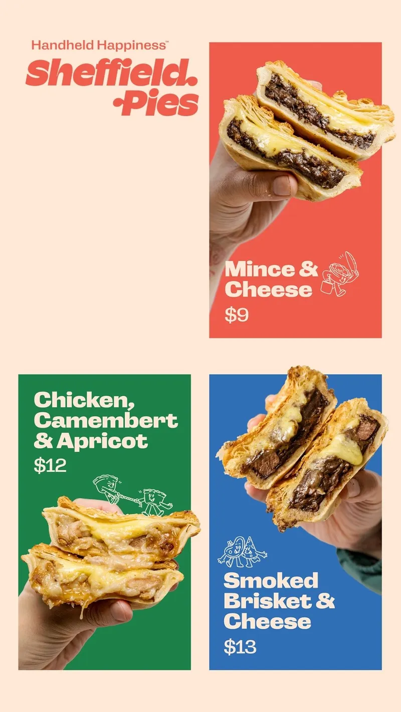 Sheffield Pies' menu includes Mince and Cheese Pies, Chicken, Cambert and Apricot Pies, and Smoked Brisket and Cheese Pies.